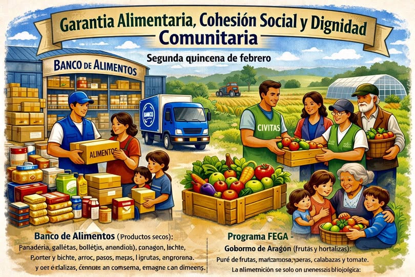 En la segunda quincena de febrero se ha desarrollado un nuevo operativo de distribución alimentaria en el barrio de Las Fuentes, gracias a la colaboración del Banco de Alimentos de Zaragoza y del Programa FEGA – Gobierno de Aragón. Esta actuación ha estado dirigida a familias vulnerables y en riesgo de exclusión social, reforzando la seguridad alimentaria y el acompañamiento social en el distrito.